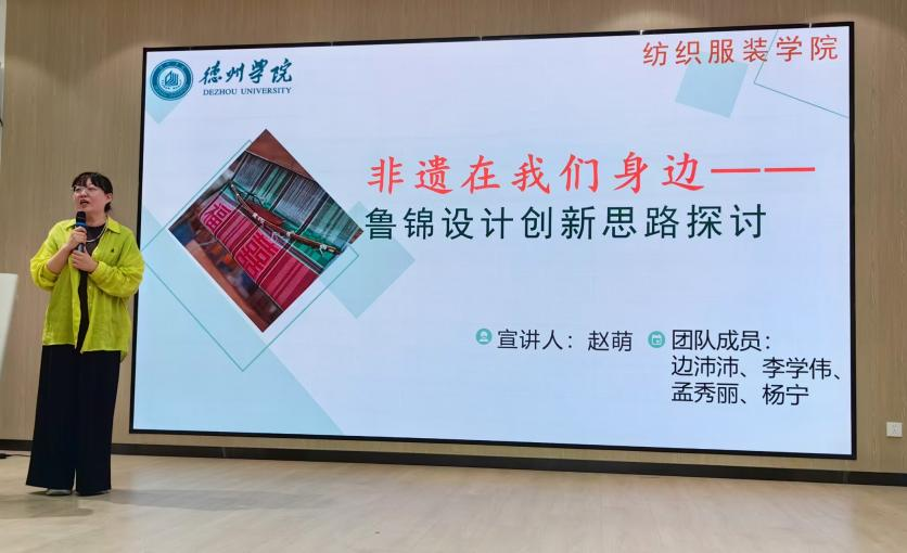 随后,三位专家分别就大赛相关内容进行了详细介绍。首先,山东纺织工程学会副理事长曲延国对比赛流程、参赛要求、评审标准及奖项设置等事项进行了系统解读,帮助同学们清晰了解赛事安排。紧接着,飘花理论无限赵萌副教授围绕鲁锦的设计原则与创新思路作了专题讲解,从纹样构成、色彩寓意、工艺特点等方面深入剖析鲁锦的艺术内涵,为同学们提供了扎实的文化理论基础。