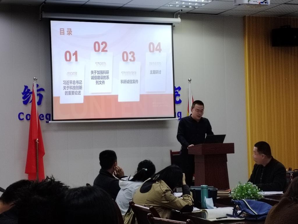 学院分管学科建设负责人讲解了习近平总书记关于科技创新的重要论述,带领全体教职工共同学习了《关于进一步加强科研诚信建设的若干意见》、《科研失信行为调查处理规则》、《高等学校预防与处理学术不端行为办法》、《关于进一步弘扬科学家精神加强作风和学风建设的意见》等关于加强科研诚信建设的系列文件,并引用了一些科研诚信案件作为警示教育,使全体教职工认识到科研诚信的重要性。最后结合警示案例,全体教职工进行了科研诚信研讨活动,与会老师从各自科研实践出发,对加强科研诚信建设的必要性进行了交流和表态发言。