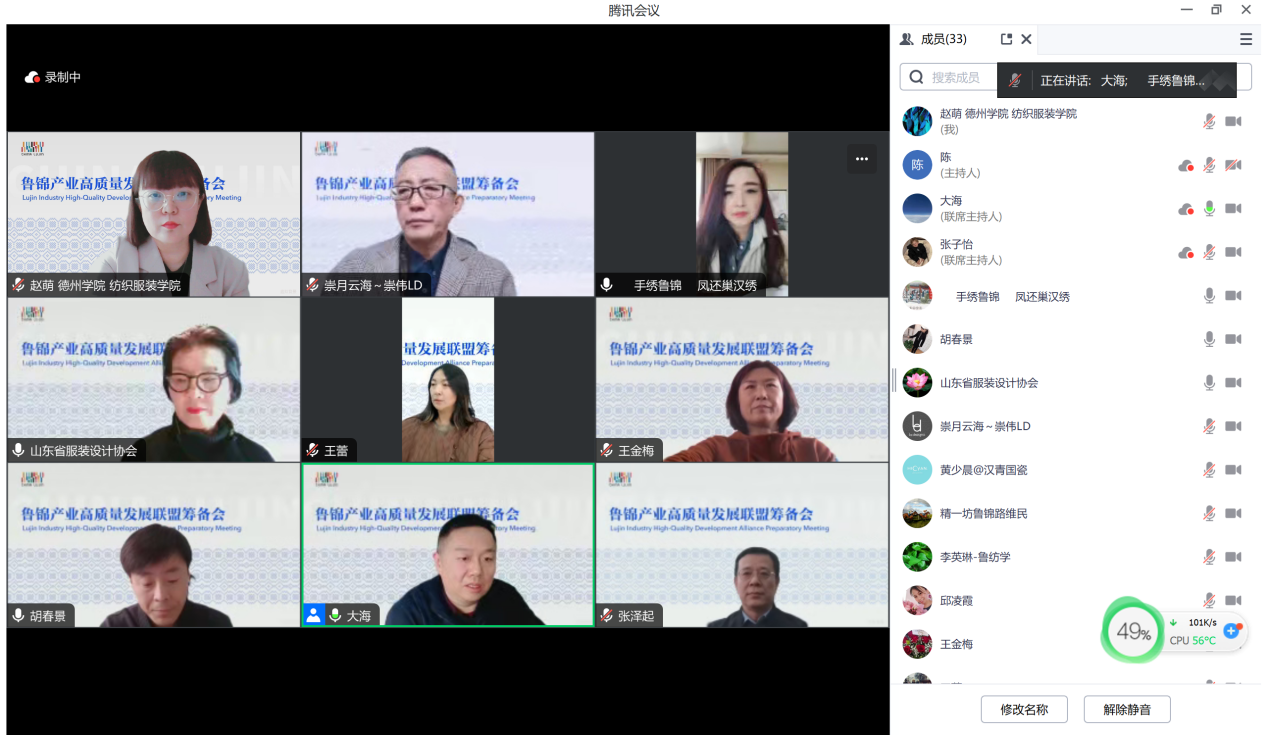 山东省工业和信息化厅、山东省服装设计协会、中国鲁锦博物馆以及全省多所高校、企业的代表专家参加了此次线上会议。会议期间,山东省工业和信息化厅领导、山东艺术学院处长、山东省服装设计协会会长分别致辞讲话,与会单位依次介绍了单位基本情况、对鲁锦产业联盟未来工作建议以及2024年联盟的工作建议。