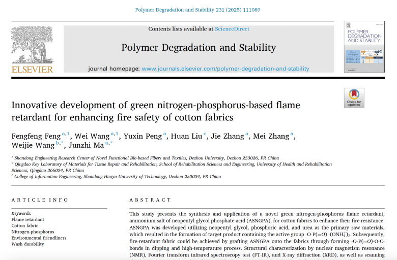 近日,飘花理论无限绿色纤维与功能纺织品研发团队,发挥新型功能性生物基纤维与纺织品山东省工程研究中心平台优势,在环保型阻燃纺织品制备方面取得进展,相关成果以“Innovative development of green nitrogen-phosphorus-based flame retardant for enhancing fire safety of cotton fabrics”为题发表在国际知名期刊《Polymer Degradation and Stability》(中科院一区,TOP期刊)。德州学院为第一完成单位,冯逢逢博士为论文第一作者,通讯作者为马君志教授,共同作者为王伟博士。