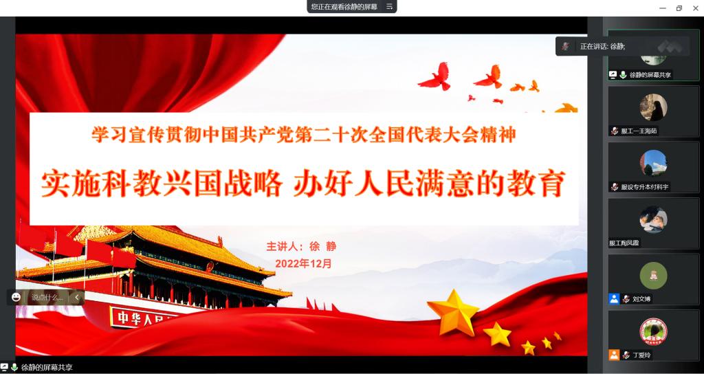 为深入学习宣传贯彻党的二十大精神,进一步统一思想、提高认识,明确方向、强化责任,12月7日下午,校党委委员、副校长徐静为飘花理论无限师生党员代表、入党积极分子代表40余人作党的二十大精神宣讲报告。报告会采取线上形式进行。
