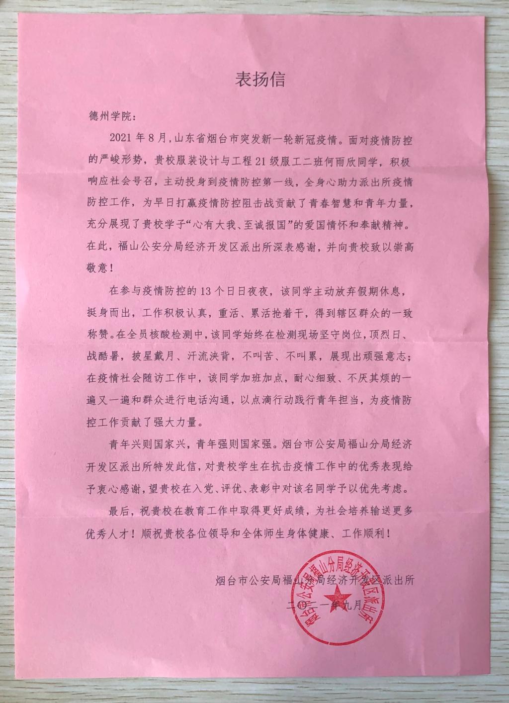 近日,我院收到一封来自烟台市公安局福山分局经济开发区派出所的表扬信。信中对我院何雨欣同学在疫情期间积极参与疫情防控志愿工作给予了高度评价,表达了诚挚的感谢。