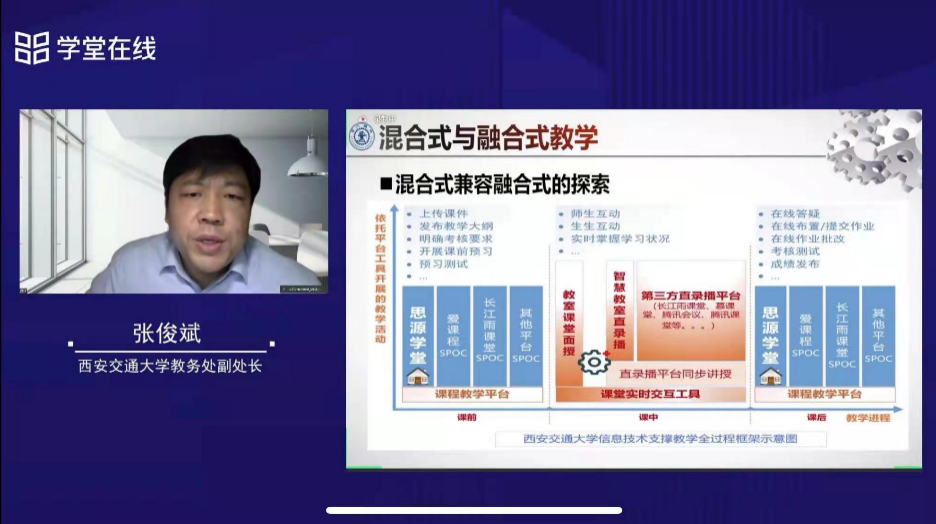 会议采用线上方式召开,教育部在线教育研究中心负责人、部分高校教务院长和处长出席会议并做了报告,报告主要围绕疫情防控常态化下的融合式教学模式、融合课堂教学质量提升措施、融合式教学的组织与管理等主题开展。