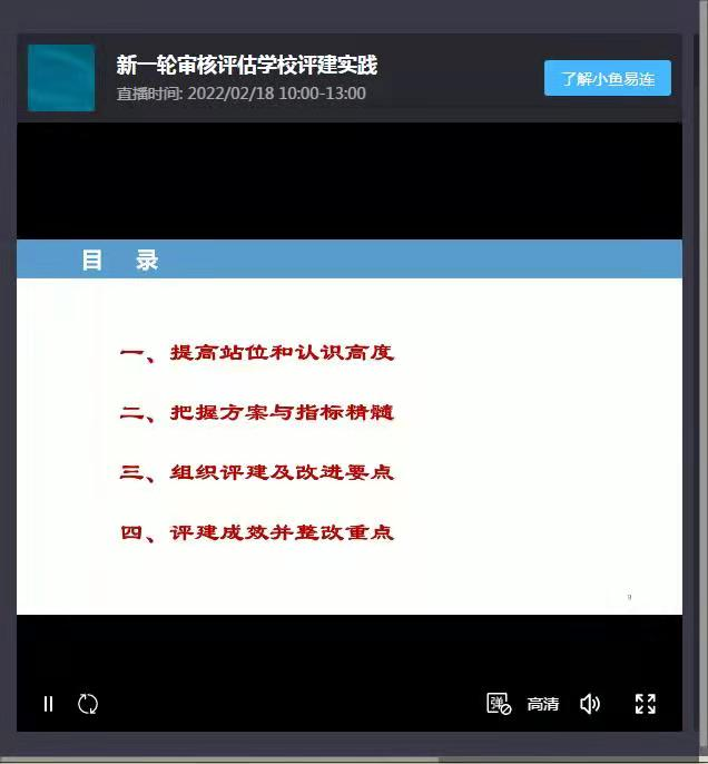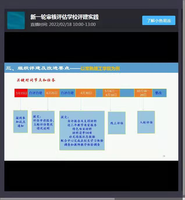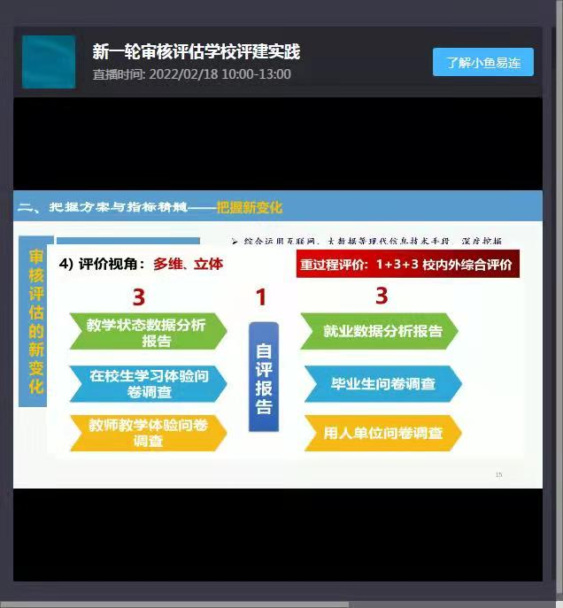 通过观看黄文祥教授的报告,我院各级领导和专业负责人进一步认识到了审核评估的重要性,进一步掌握了审核评估的流程和指标,为下一步开展审核评估工作提供了思路。