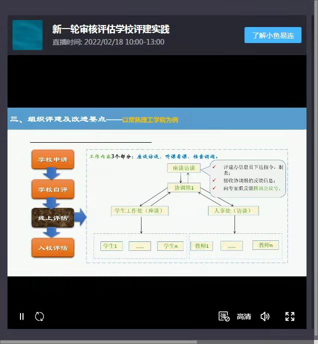 会议在麦可思公益平台进行,会议由评估专家、常熟理工学院教学质量管理处处长黄文祥做了题为“新一轮审核评估学校评建实践”的报告,报告从提高站位和认识高度、把握方案与指标解读、组织评建及改进要点、评建成效并整改重点几个方面进行了阐述。