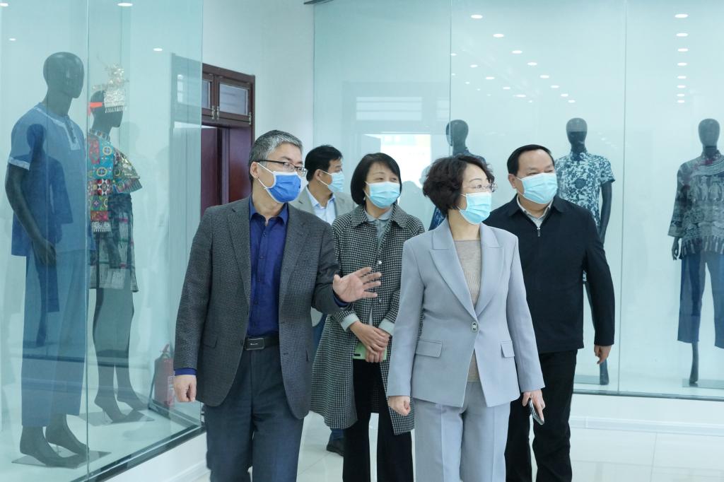 学院院长、大学生志愿讲解员,通过向来访嘉宾详细介绍国家纺织面料馆的丰富展品,阐释了中华服饰文化蕴含的智慧与情感、创新与包容,以及中国服饰的美学精神和科学内涵。祁小青充分肯定了我院国家纺织面料馆德州分馆近几年取得的成绩,希望学院继续发挥人才和学科优势,在校地合作、校企合作、科学普及、文化传播等方面继续发挥重要作用。