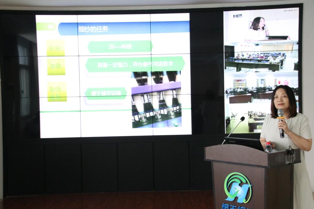 培训以《细纱工艺设计理论提升与实践》为题,张梅教授主要从细纱工艺的设计原理、任务、设计概要等内容进行讲解,并就恒丰集团职工在实际操作和生产中遇到的问题进行了详细的解答。