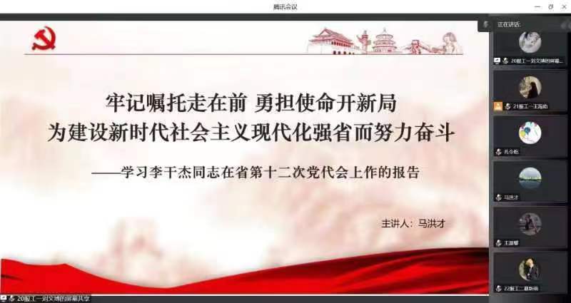 学院党委班子成员于在线上为学生党员代表和积极分子上了题为《坚定初心信仰传承红色精神》、《牢记嘱托走在前勇担使命开新局为建设新时代社会主义现代化强省而努力奋斗》等专题党课。党课上,班子成员围绕学习李干杰同志在省第十二次党代会上作的报告,从五年奋进取得重大历史性成就、聚焦聚力新时代社会主义现代化强省建设重点任务、坚定初心信仰推进新时代党的建设新的伟大工程等方面等方面开展论述。