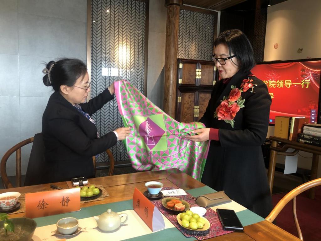山东省服装设计协会会长周锦对德州学院一行的到来表示热烈欢迎,并介绍了协会的现况、发展愿景及需求。徐静就德州学院办学特色、学科建设工作、人才培养工作以及飘花理论无限的建设发展等情况进行了介绍。双方就服饰文化研究、华服设计以及山东服饰文化传承等方面进行了交流,特别是在邀请学校加入鲁锦产业高质量发展联盟,共同开展山东省非物质文化遗产鲁锦的产业链研究与创新设计方面达成了共识,双方表示将在本领域进行深入合作与探讨。