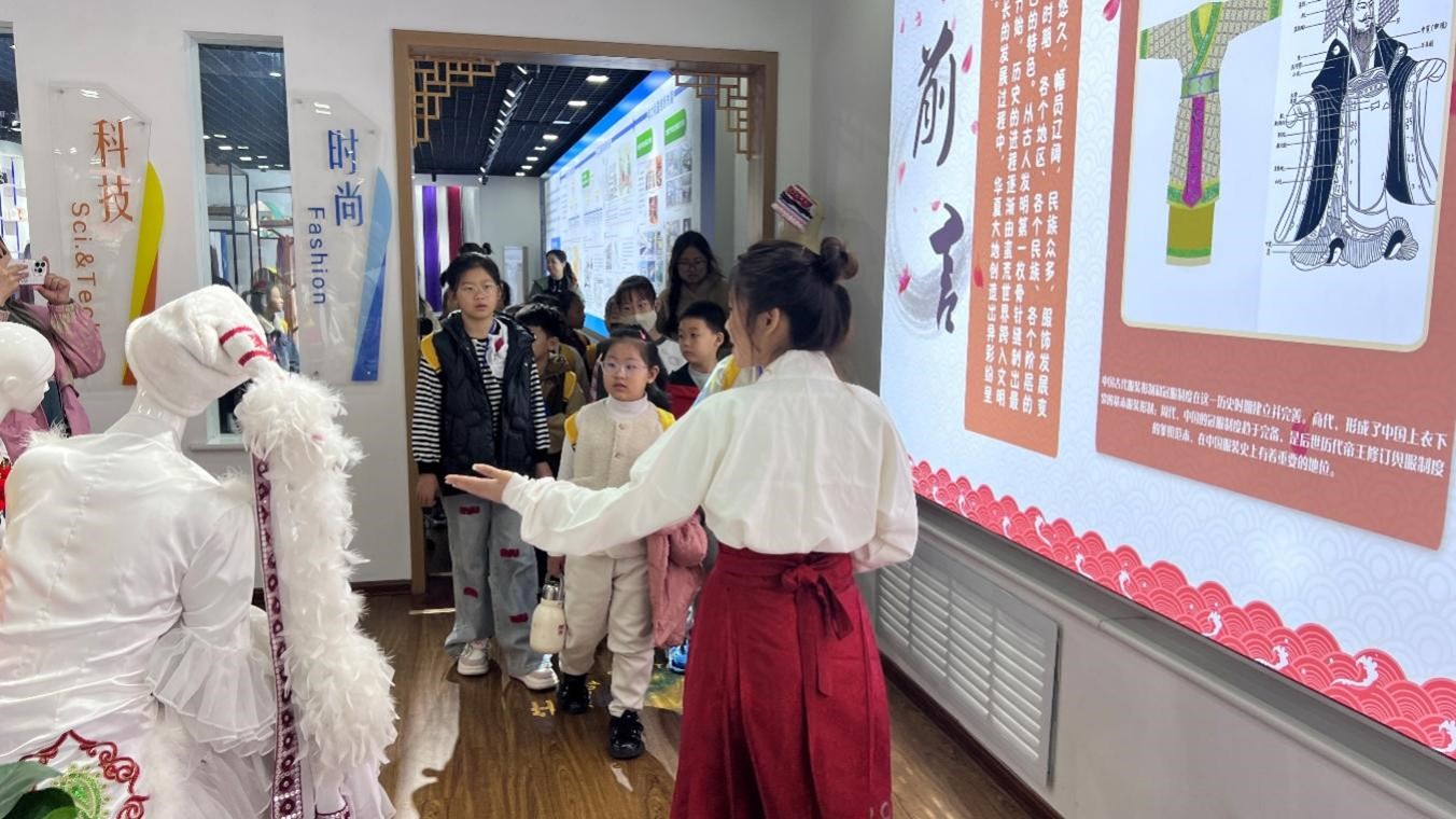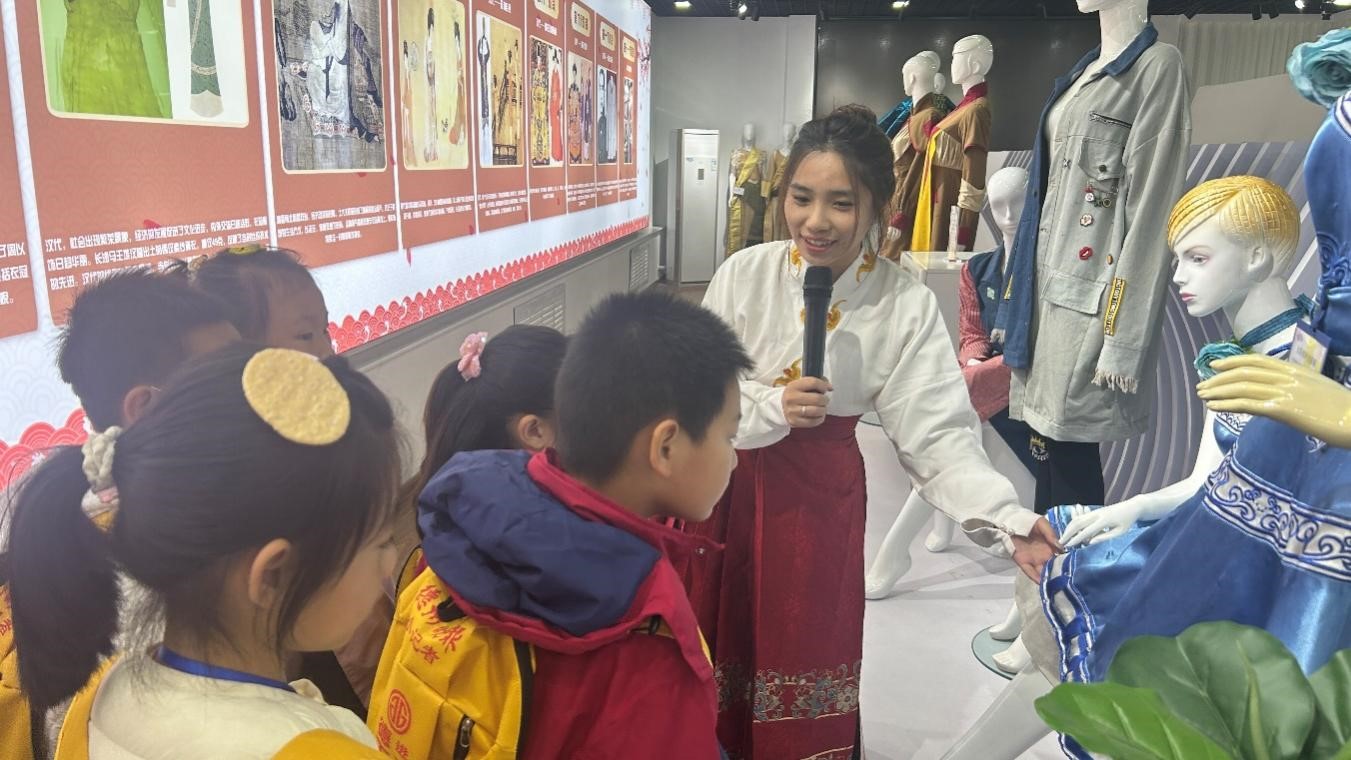 活动现场,由学生讲解员带领着小记者们先后参观了面料展室、齐鲁服饰展室、染缬艺术展室、服装展室、鲁锦展览馆等展厅。小记者们在讲解员的介绍下,切身感受到了纺织面料之美,深入了解了纺织科技的飞速发展。在面料展室,学生志愿者为小记者们详细讲解各种新型绿色环保面料和功能纱线产品,小记者们深入探索了纺织面料的奥秘。在染缬展馆,小记者们看到由我院师生共同制作的造型精美、工艺精湛的染缬艺术作品,深受震撼,纷纷竖起了大拇指。在鲁锦展馆,小记者们对云肩、肚兜、裙襕以及绣花包袱等齐鲁服饰产生浓厚兴趣,领略了山东地区独特的服饰文化和织造技艺。