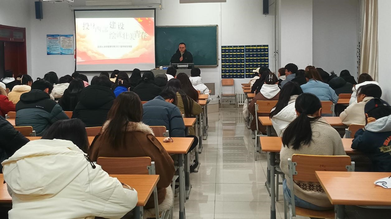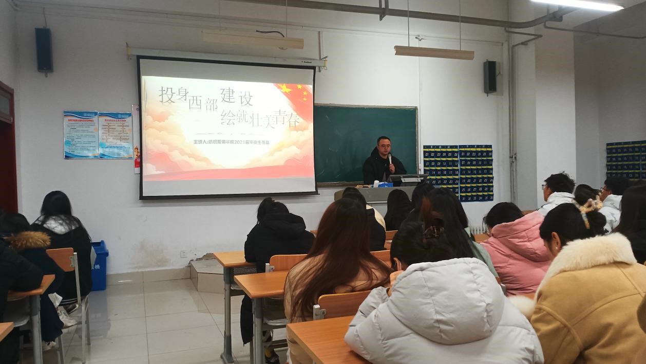 为积极响应国家政策号召,增进同学们对西部计划的了解,12月7日,飘花理论无限于明理楼0150教室举办“投身西部建设,绘就壮美青春”主题讲座,本次讲座邀请了我院2021届优秀毕业生张猛担任主讲人,我院团委书记和部分学生参加。