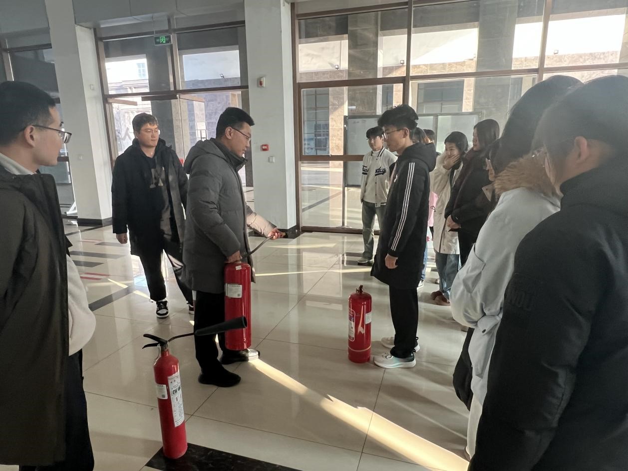 在灭火器使用培训环节,实验中心老师系统讲解并现场演示了常见灭火器的种类及其适用范围。干粉灭火器、二氧化碳灭火器和泡沫灭火器各具特点,其中,针对带电设备和精密电子仪器等贵重设备火灾,二氧化碳灭火器因其独特的灭火原理和不导电特性成为首选,且在紧急情况下无法准确判断时,二氧化碳灭火器也具有广泛适用性。老师还以实际操作向同学们展示了灭火器的正确使用步骤:首先提起灭火器轻轻摇晃,使内部药剂充分混合;接着拉出保险销;随后用手稳握喷管,精准对准火焰根部;最后保持安全距离,果断按压手柄进行灭火操作,整个过程一气呵成。同学们纷纷围拢观摩,学习氛围浓厚。