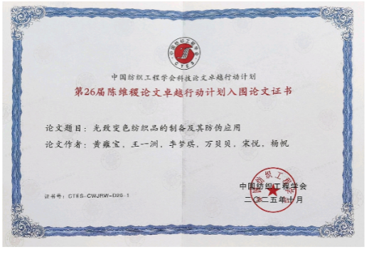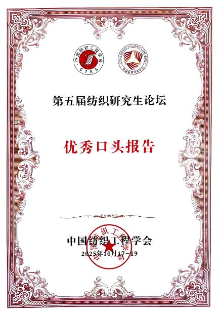 第十五届中国纺织学术年会于2025年10月17-19日在江苏南通召开,我院硕士研究生黄雍宝撰写、杨帆副教授指导,我校为第一完成单位的学术论文《光致变色纺织品的制备及其防伪应用》,成功入围第26届陈维稷优秀论文卓越行动计划,并被推荐至《纺织学报》快速发表。同时,黄雍宝同学在第五届纺织研究生论坛上表现出色,荣获大会颁发的“优秀口头汇报”奖。