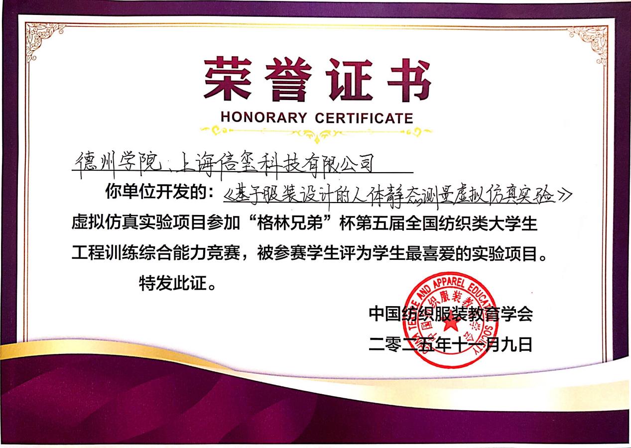 在刚刚结束的第五届全国纺织类大学生工程训练综合能力竞赛中,我院开发的“基于服装设计的人体静态测量虚拟仿真实验”作为比赛项目,荣获服工组“学生最喜爱实验项目”。