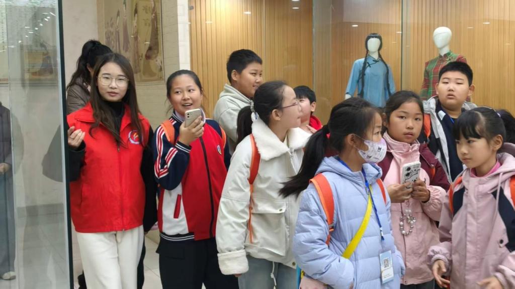 活动伊始,小记者们在展馆讲解员的专业引导下,先后参观了现代展室、历代展室、鲁锦展室等多个展厅。参观过程中,小记者们认真聆听讲解,系统了解了灰缬、绞缬、夹缬、蜡缬四大传统染缬技艺的历史渊源与工艺特点。在鲁锦展室,小记者们近距离观察鲁锦制品及民间纺织收藏艺术品,从色彩搭配到纹样设计等全面感知鲁锦的独特魅力。针对展品细节,小记者们主动举手提问,就鲁锦与普通棉布的区别等问题与讲解员进行交流,现场学习氛围浓厚。此外,展室内陈列的老式纺车、织布机等设备,也让小记者们对纺织行业的发展历程有了更为具象的认知,深刻体会到劳动人民的智慧结晶。