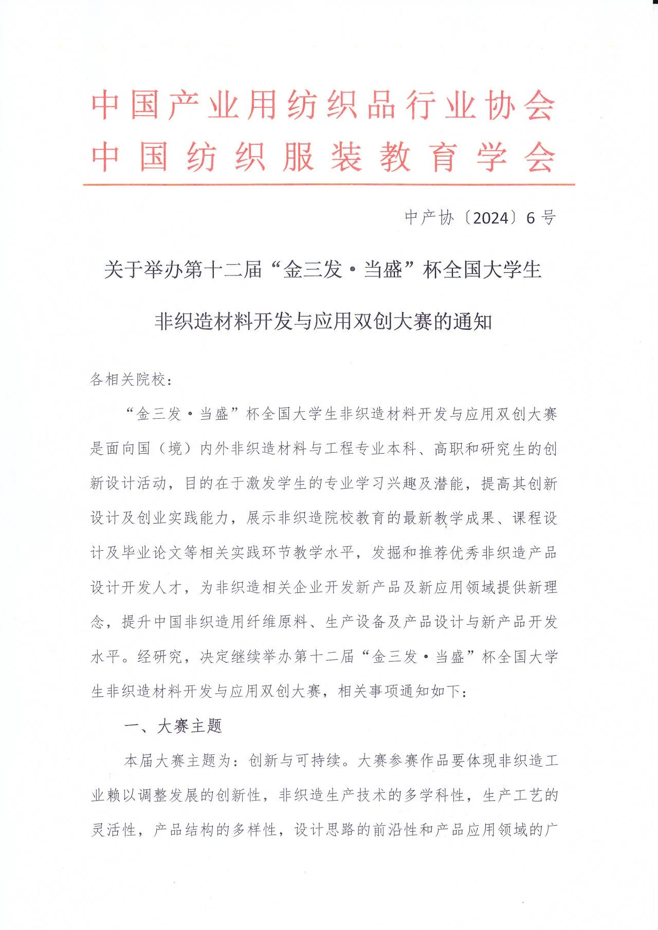 关于举办第十二届“金三发·当盛”杯全国大学生非织造材料开发与应用双创大赛的通知