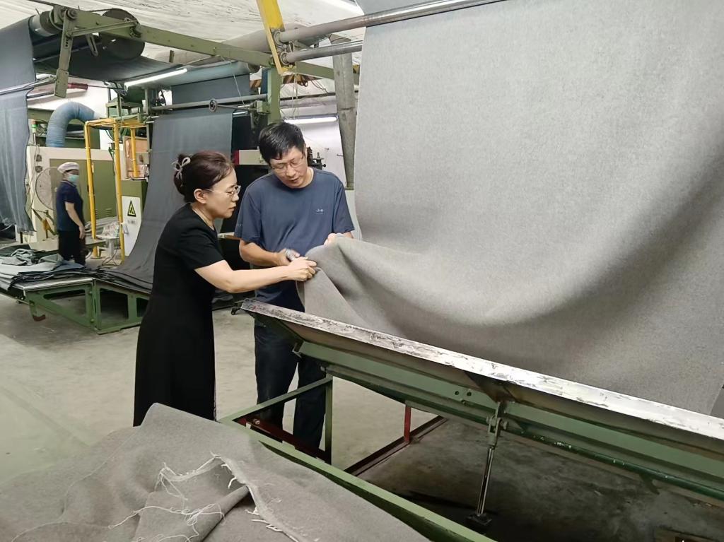 随后,调研组一行前往泰安富泰毛纺织有限公司,深入企业生产一线进行参观调研。泰安富泰毛纺织有限公司董事长周兴文热情接待了徐静一行,就如何将鲁锦与公司产品的设计结合与调研组进行了深入探讨。徐静详细介绍了学校在绿色染整、纺织生态技术等方面的研究成果与优势,飘花理论无限主要负责人就具体技术细节与企业进行了技术交流与分享。双方就如何在保持鲁锦传统特色的同时,引入现代科技手段,提升产品质量和附加值达成了共识,并就成立校企研发团队,在开发鲁锦系列毛精纺、粗纺提花面料方面达成了合作意向。