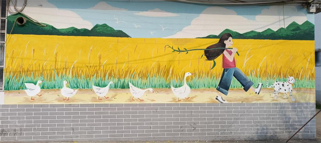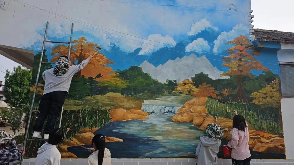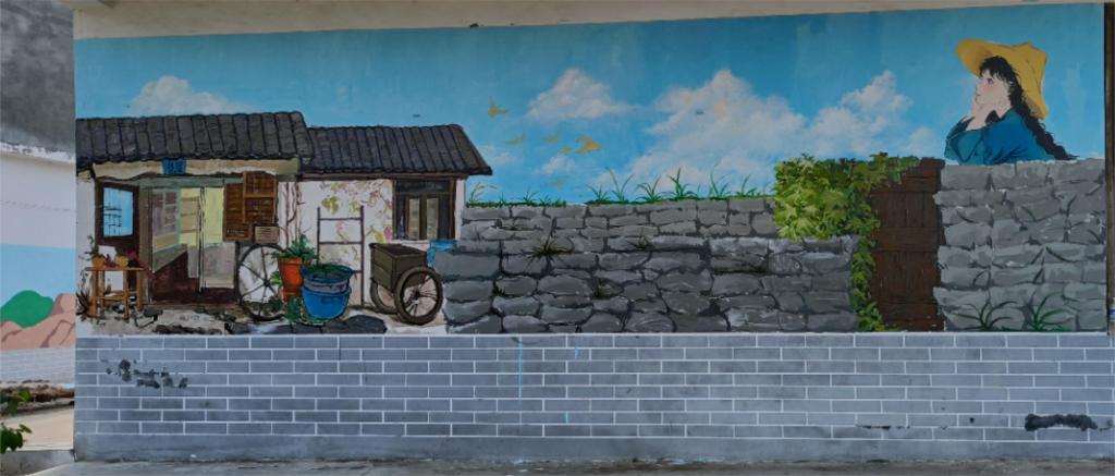在绘制过程中,志愿者们充分发挥艺术设计特长,他们手拿刷子、滚筒,调颜料、勾轮廓、图色彩,反复打磨每一面墙绘,认真勾勒每一个细节,根据绘制内容合理分工,默契配合。经过两天的努力,原本空白的墙面焕发出新的生机与活力。当墙绘艺术的创意与五彩缤纷的颜料相互碰撞,一幅幅栩栩如生的画面跃然于墙上,整个村庄充满了积极阳光、温馨美好的生活气息。志愿者们用巧手匠心点缀白墙灰瓦,用所知所学展现美丽乡村,为乡村振兴贡献青春力量。