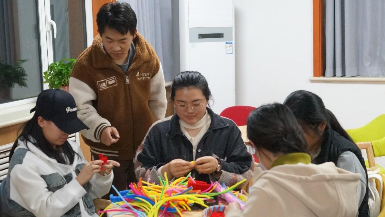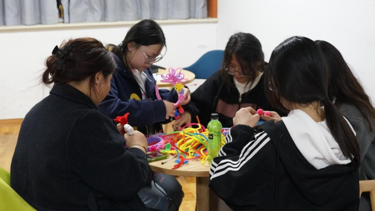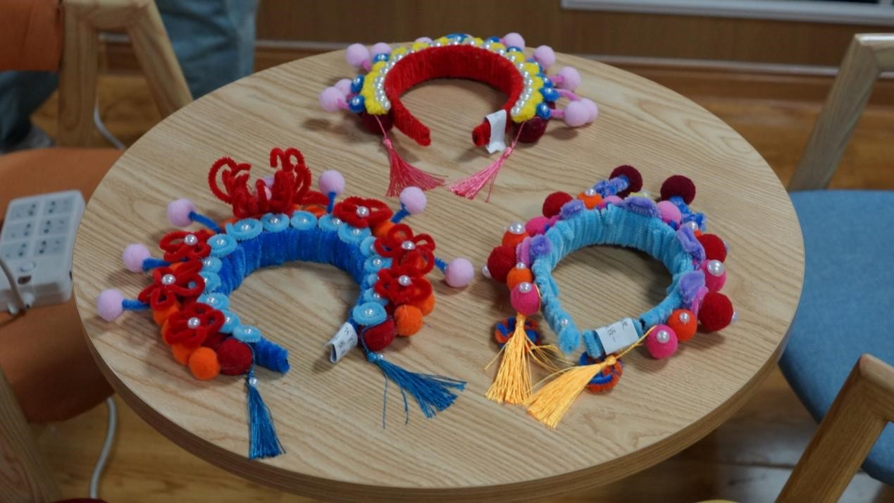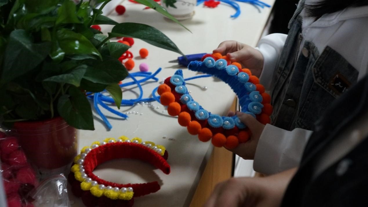 在制作环节,主讲人详细介绍了扭扭棒、珍珠贴片与各种材料的用途、效果,并重点指导了热熔胶的操作流程。在主讲人的示范和讲解下,同学们发挥创意与想象力,通过一扭一捏、一卷一折,各色扭扭棒、彩色毛球和流苏交织的京剧发箍呈现眼前。活动现场气氛热烈,同学们在制作头饰的过程中互相交流探讨、学习思考,在探索非遗奥秘、体验国粹之美中,将灵思妙想呈现于指尖。