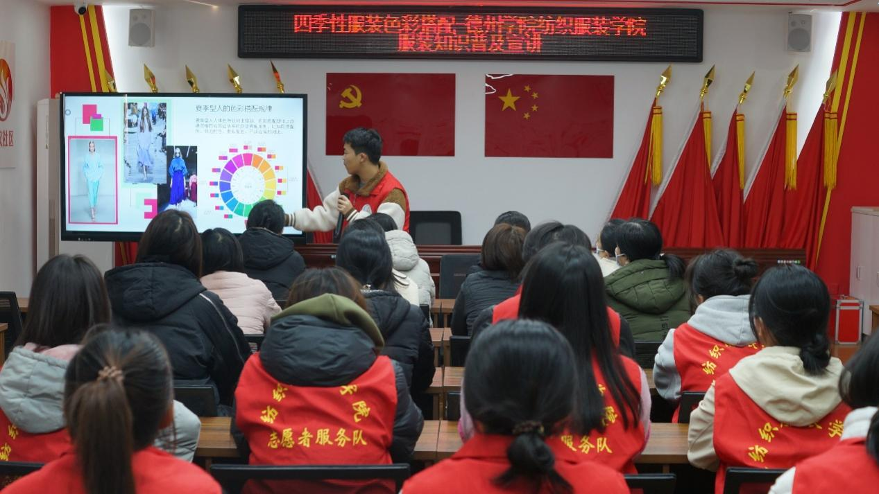 为进一步提高大学生服务社会的实践能力,充分发挥服装类学科专业知识应用转化,增进人们对服装搭配知识的了解,12月12日,飘花理论无限组织志愿者于兴文社区党群服务中心会议室开展服装知识普及宣讲活动。