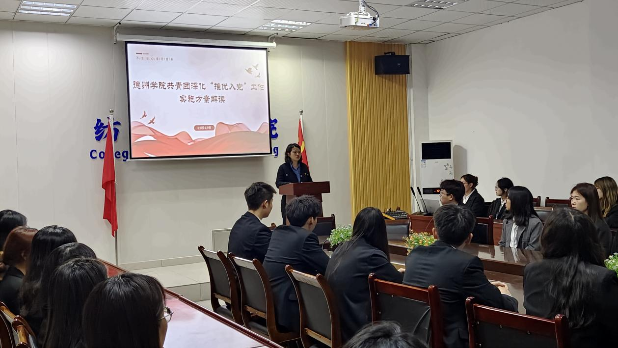 会议伊始,学院团委负责人对《德州学院共青团深化开展推优入党工作实施方案(试行)》进行了领学和解读,介绍了此次培训会的内容及目的。负责人详细阐述了推优入党的基本条件、工作流程以及“推优”工作的总体要求和工作任务等。负责人强调,推优工作是基层团组织工作的一项重要的日常性工作,基层团干部应加强学习,规范团组织推优入党程序,提高“推优”能力。最后,参会的团支部书记们就本次会议的讲解内容进行提问,负责人逐一解答,以确保本次推优工作有序规范的开展。
