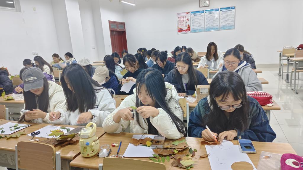 活动伊始,他们巧妙地运用现场准备的树枝、细绳、卡纸等材料,充分发挥自己的想象力和创造力,将落叶修剪、拼接、粘贴,经过同学们的精心制作,一系列风格各异的落叶手工艺品逐一呈现,每一件作品都凝聚着同学们的匠心巧思和对自然之美的独到理解,同学们纷纷表示,这不仅是一种环保的创意方式,还是能让我们更加亲近大自然,感受季节的更替之美的奇妙体验。