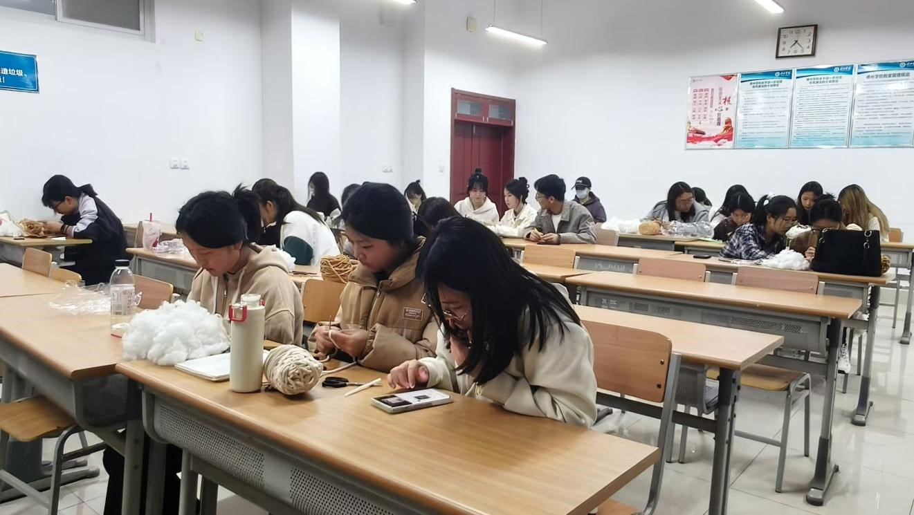 活动伊始,负责人将准备好的毛线、钩针、填充棉等材料分发给同学们,并现场演示了玩偶缝制过程,在负责人的悉心指导下,同学们拿起钩针,跟着教学步骤耐心细致地勾勒出自己心仪的小熊。编织过程中,同学们逐渐掌握了起针、收针、加减针等基础技法,大家一边灵巧地穿梭针线,一边愉快地交流编织心得与生活趣事,时而虚心求教,时而热情分享,教室里洋溢着此起彼伏的欢笑声和热烈的讨论声。经过同学们巧手编织,各色柔软的毛线在均匀针脚地勾勒与精准的加减针技法中渐渐成型,一针一线间,那些憨态可掬的绒线小熊便栩栩如生地跃然于掌上,看着自己手里的小熊,同学们眼中闪烁着自豪的光芒,内心充满成就感。