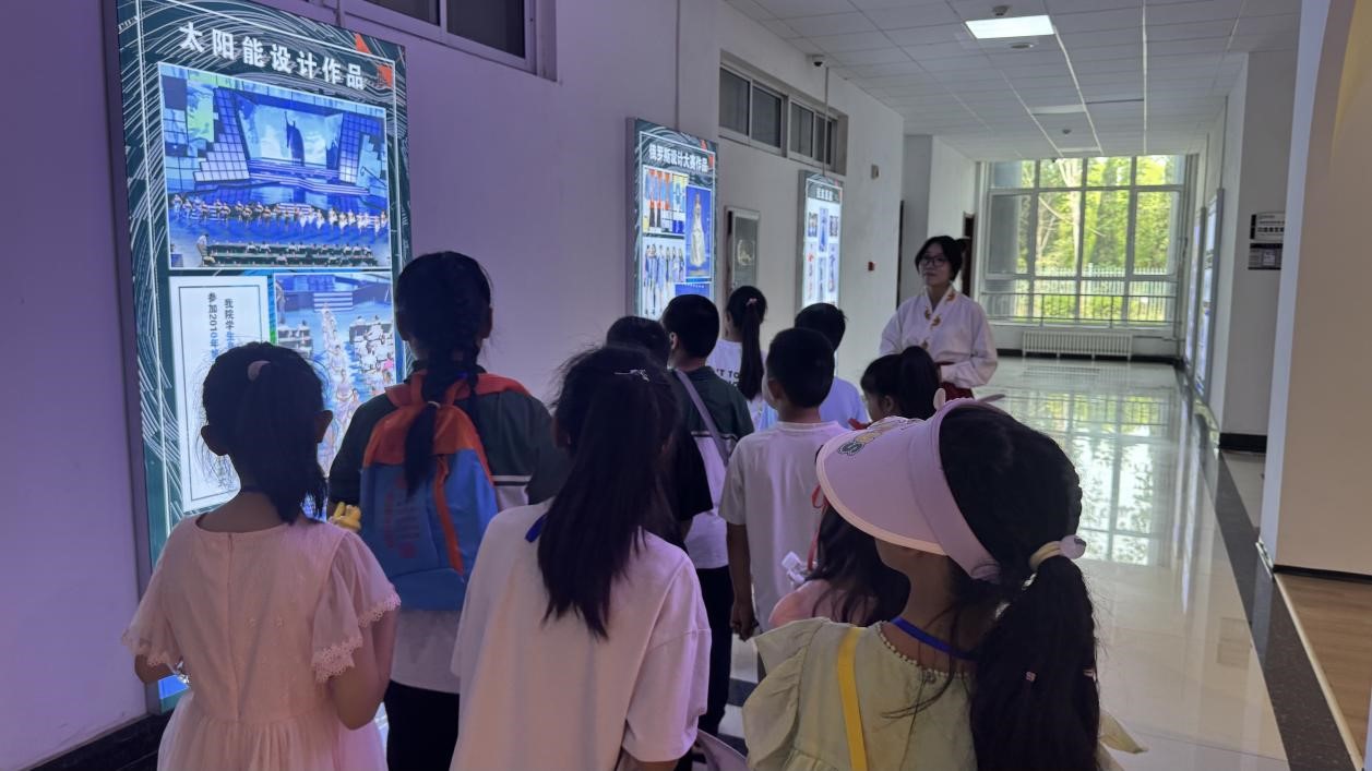 活动伊始,小记者们在学生讲解员带领下,开启纺织文化奇妙之旅。小记者们先后参观了面料展室、齐鲁服饰展室、染缬艺术展室、服装展室、鲁锦展览馆等展厅。小记者们紧紧跟着讲解员,走进各个展室,轻轻触摸各类面料,感受到纺织面料之美。讲解员在面料展室为小记者们详细讲解了各种新型绿色环保材料和功能纱线产品。随后小记者们在染缬展馆看到了由我院师生共同制作的造型精美、工艺精湛的艺术作品,了解到了灰缬、绞缬、夹缬、蜡缬四大类染缬技术,同时还参观了以鲁锦为主题的展馆,在精美的鲁锦制品及民间收藏艺术品中深刻感受到了鲁锦之美。展馆中的展品,不论是多彩的功能性面料织物,还是绚丽的蓝白染缬工艺品,都激发起了小记者们对传统纺织文化的浓厚兴趣,鲁锦柔软舒适花纹斑斓精致,更是让小记者们在开阔眼界的同时感受到纺织文化的别样魅力。