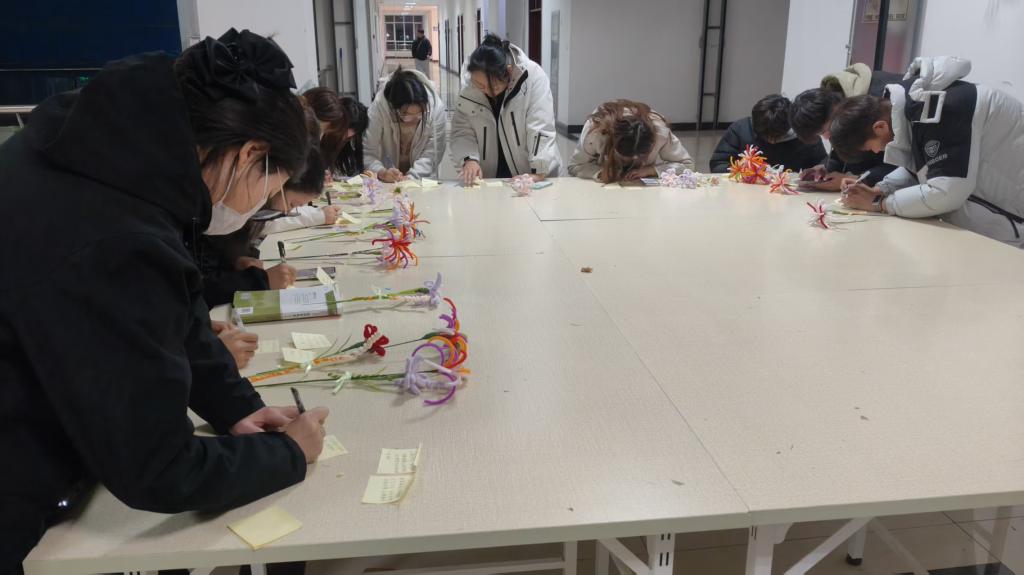 活动分三个环节有序开展:在逐光必胜花扭扭棒制作环节,同学们围坐桌前手持各色扭扭棒,在负责人指导下,有条不紊地进行缠绕、塑形与点缀,充分发挥创意完成主题花束,并逐一系上写有励志话语的纸条,一朵朵饱含心意的花束逐渐成型;在研梦祈愿墙绘制环节,同学们充分发挥专业特长,巧妙构思,将励志话语用细腻笔触完成黑板创作,寓意美好的墙绘为考研教室增添了温暖的备考氛围;在研梦便签环节,负责人提前备好彩笔与祈愿卡,同学们与考研学子纷纷提笔写下祝福与期许,逐一贴满祈愿墙,现场温情涌动。参与活动的同学纷纷表示,亲手为学长学姐制作每一份独一无二的祝福,不仅传递了真挚的鼓励,更让他们深切感受到了学院大家庭的温暖与凝聚力。