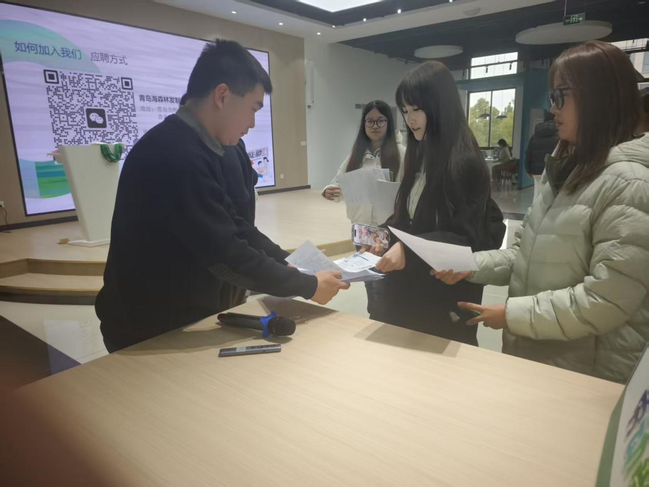 招聘会上,青岛海森林发制品集团股份有限公司招聘主管李宁向我院毕业生发放企业宣传资料,并通过系统宣讲,全面介绍了公司发展概况、产业布局、发展历程、未来战略规划以及各岗位任职标准。企业还采用有奖问答的方式,调动毕业生参与积极性,针对毕业生普遍关注的职业发展路径、培训培养体系、薪酬福利待遇及工作地点分布等核心问题,逐一进行细致解答,现场互动氛围热烈。毕业生认真聆听宣讲、积极咨询详情,充分展现出浓厚的求职热情与良好精神风貌。会后,有意向的毕业生在企业招聘主管的指导下,通过指定渠道提交个人信息与简历,部分同学现场参与初步沟通环节。